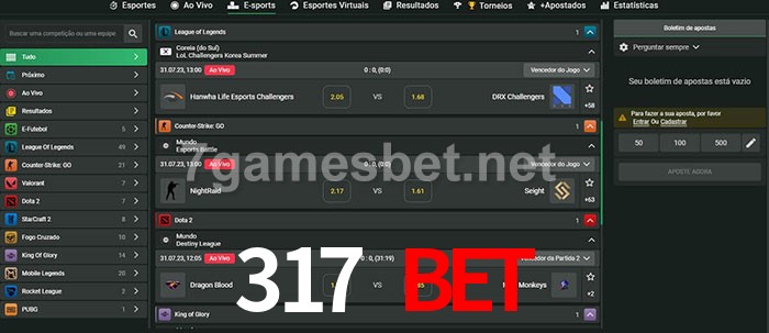 O 317 Bet oferece uma grande seleção de opções de apostas em e-sports com probabilidades competitivas